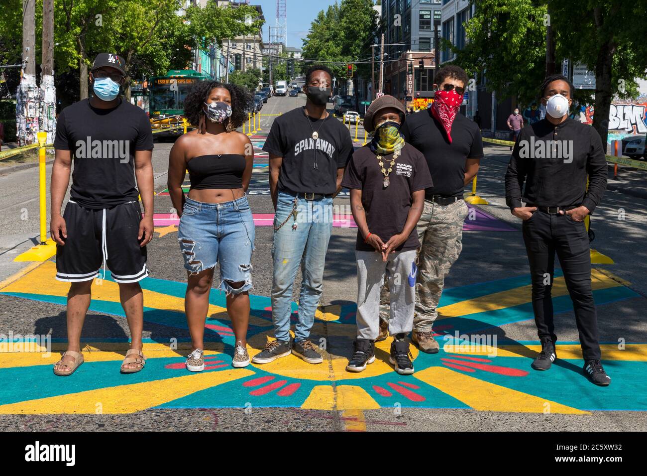 Artists Who Painted The Black Lives Matter Mural In The Former Capitol Hill Occupied Protest Zone Pose For A Photo On The Work In Seattle On Sunday July 5 2020 Left To